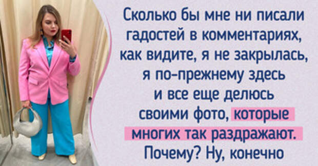 Меня зовут Марина, и я вешу 95 кг. Как вы понимаете, это почти сотка. Заботит ли меня это? Нет. Потому что это всего лишь кем-то навязанные цифры. Главное ведь, как вы сами себя ощущаете в своем теле.